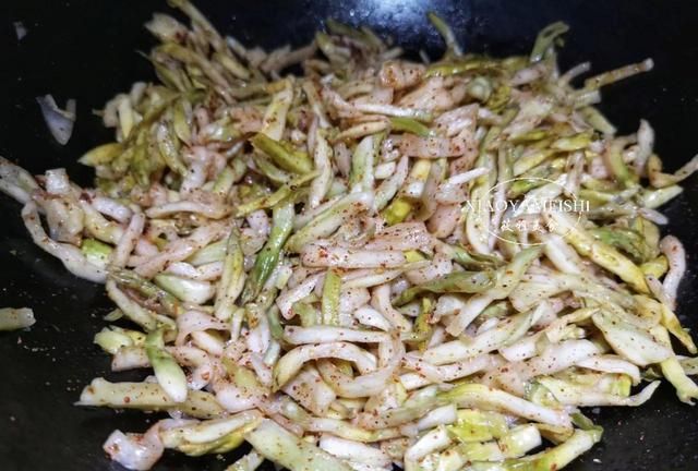 7、3天后,將兒菜從瓶子中夾出,熱鍋放入少許油,開小火冷油倒入自制的五香粉,翻炒片刻至香味飄出;